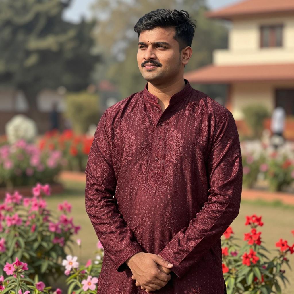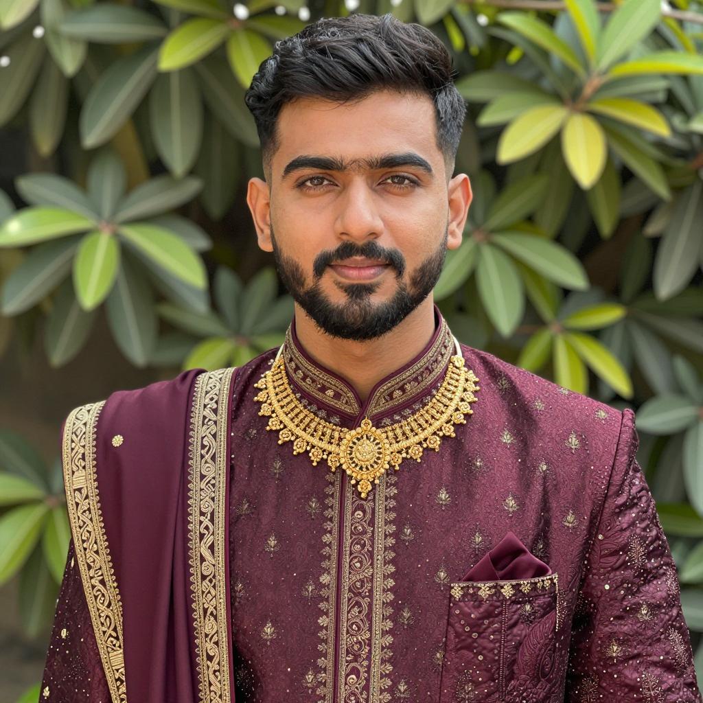 Indian groom reception suit, photograph of a handsome Indian man, medium build, short black hair, neatly groomed beard, wearing a green traditional sherwani with gold buttons and a beige pocket square, standing in front of a blurred building with large windows, daylight, serious expression, natural light, subtle shadows, urban background, close-up, portrait style, elegant attire, cultural fashion