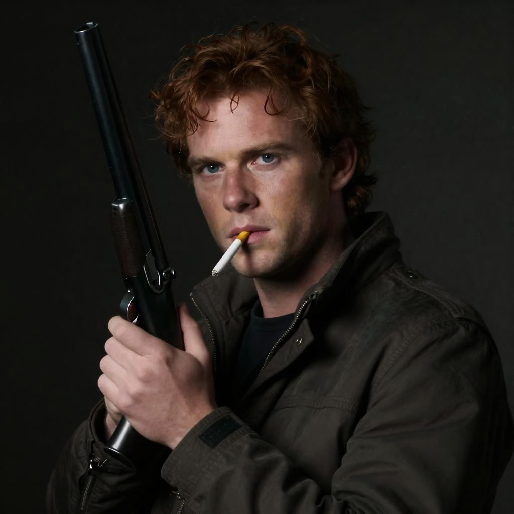 Photograph of a man with wavy, reddish-brown hair and intense blue eyes, holding a black, double-barreled gun to his right. He has a cigarette in his mouth and is wearing a dark, puffy jacket. The background is dark with a light beam highlighting his face. His expression is serious and focused.