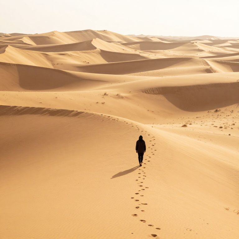 Photograph of a vast, sunlit desert with rolling sand dunes in warm golden hues. A solitary, silhouetted figure, dressed in dark clothing, walks across the sandy terrain, leaving a trail of footprints behind. The figure's shadow stretches to the right due to the low angle of the sunlight. The texture of the sand appears smooth yet undulating, with gentle waves of dunes extending into the background. The sky is bright white, almost overexposed, contrasting with the warm tones of the sand. The overall scene evokes a sense of isolation and vastness.