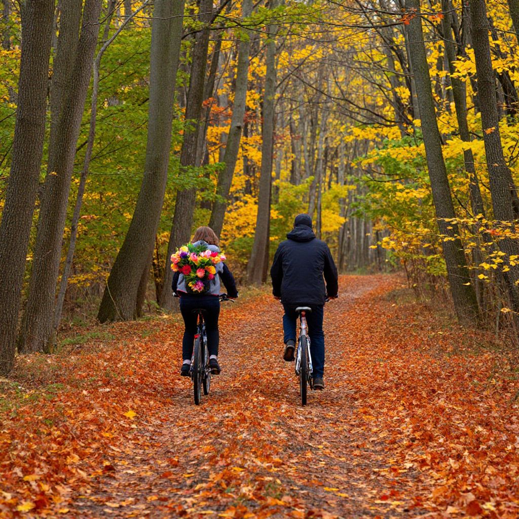 In this photorealistic photograph, two individuals are biking through a vibrant autumn forest. The man, dressed in a dark jacket and hat, is positioned to the right, while the woman, adorned with a colorful floral arrangement on her back, is to the left. The path they traverse is carpeted with a rich tapestry of fallen leaves in shades of orange, red, and yellow, creating a vivid contrast against the greenery of the trees. The forest itself is dense with tall, slender trees, their leaves a mix of green and yellow hues, suggesting the transition into fall. The overall composition is balanced, with the cyclists aligned centrally, leading the viewer's eye through the scene. The 100mm lens used captures the details of the leaves, the texture of the clothing, and the subtle interplay of light and shadow, enhancing the depth and realism of the image.