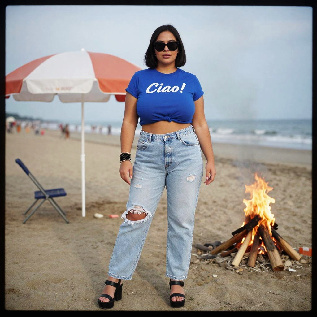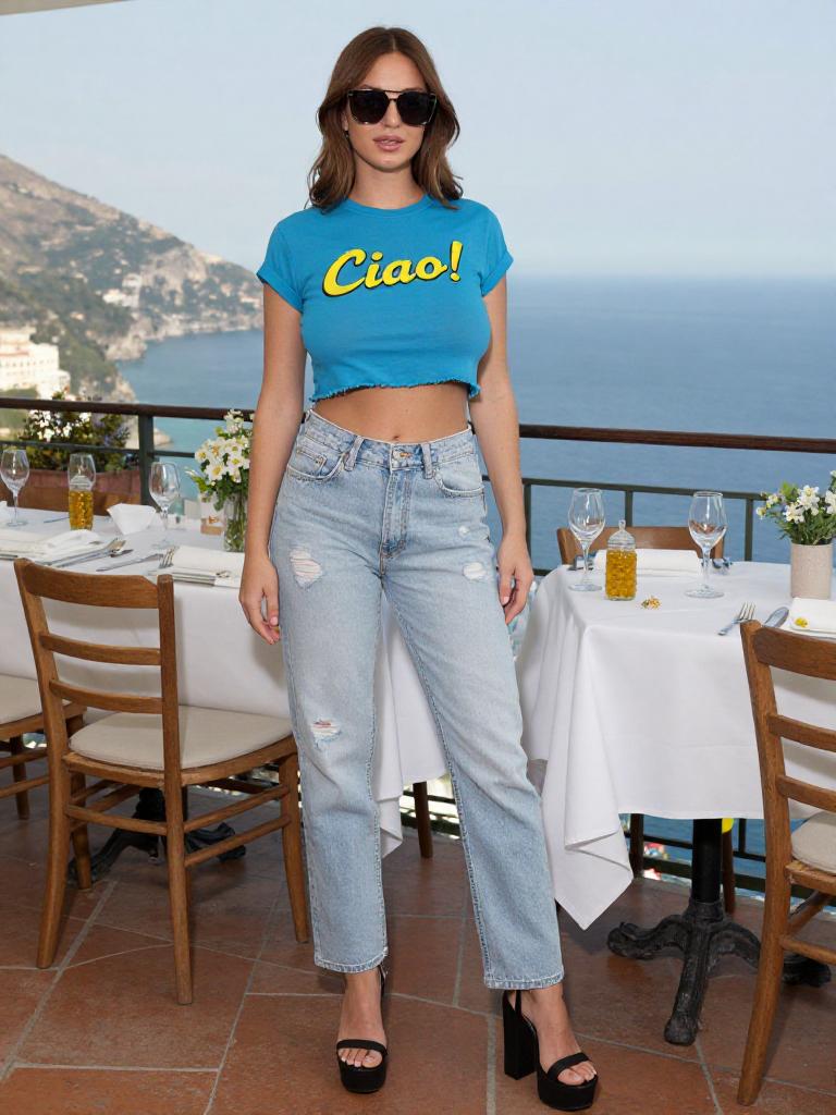 A woman, in a vintage photo style, wearing a blue cropped t-shirt with Ciao! print and light-wash distressed jeans, standing at an Italian Banquet on an Amalfi Coast Terrace, with black platform sandals and dark sunglasses, enjoying the scenic view. Sexy. Pretty face and beаutiful eyes. Big breasts