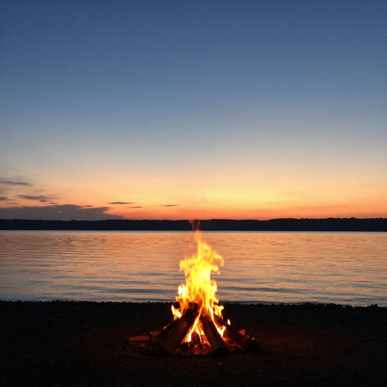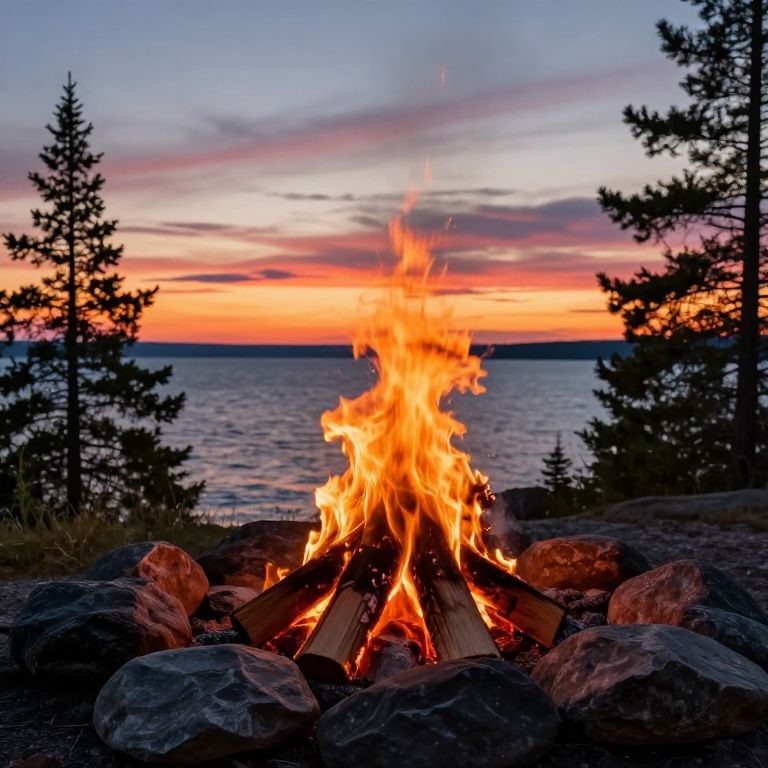 Vibrant flames dance warmly around a campfire, encircled by smooth gray rocks, as the fiery hues of a sunset paint the sky above Lake Superior, casting a serene glow over the tranquil waters and silhouetted pine trees.