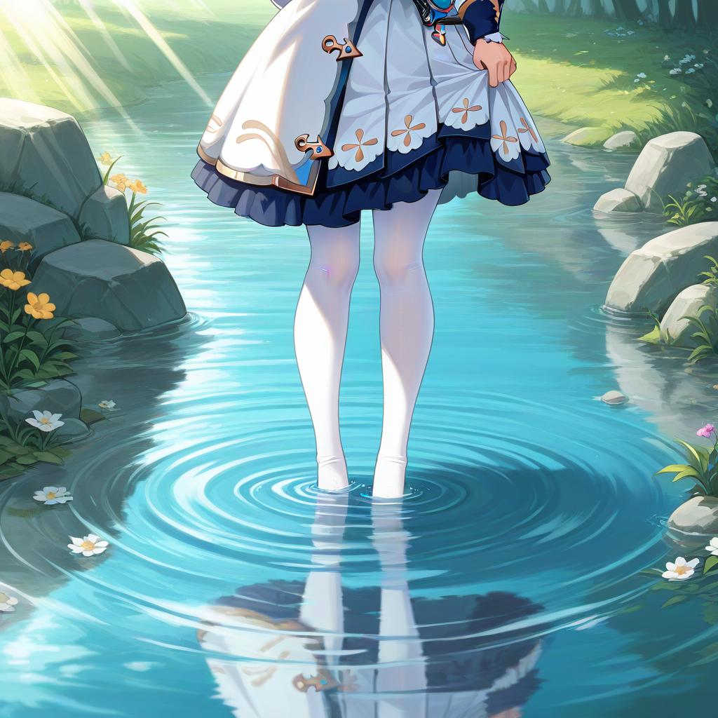 Barbaradef, white dress, white pantyhose, book, masterpiece, best quality, barbara \(genshin impact\), 1girl, solo, full body, grabbing skirt, standing in water, sunlight, flowers, creek, stone, clean water, ripples, reflective water, reflection, shadow