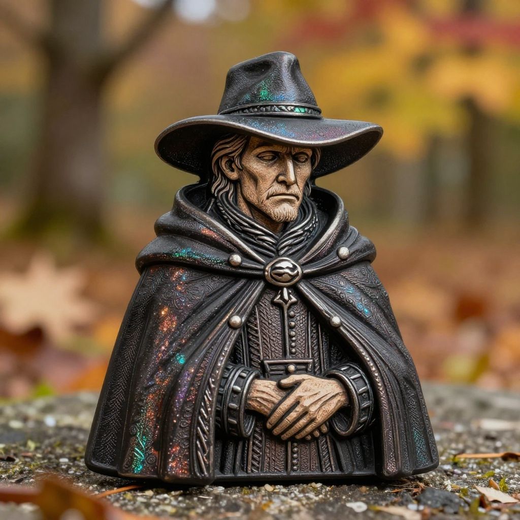 Photograph of a detailed, realistic wizard statue with a dark, starry cloak, wide-brimmed hat, and solemn expression, set in a