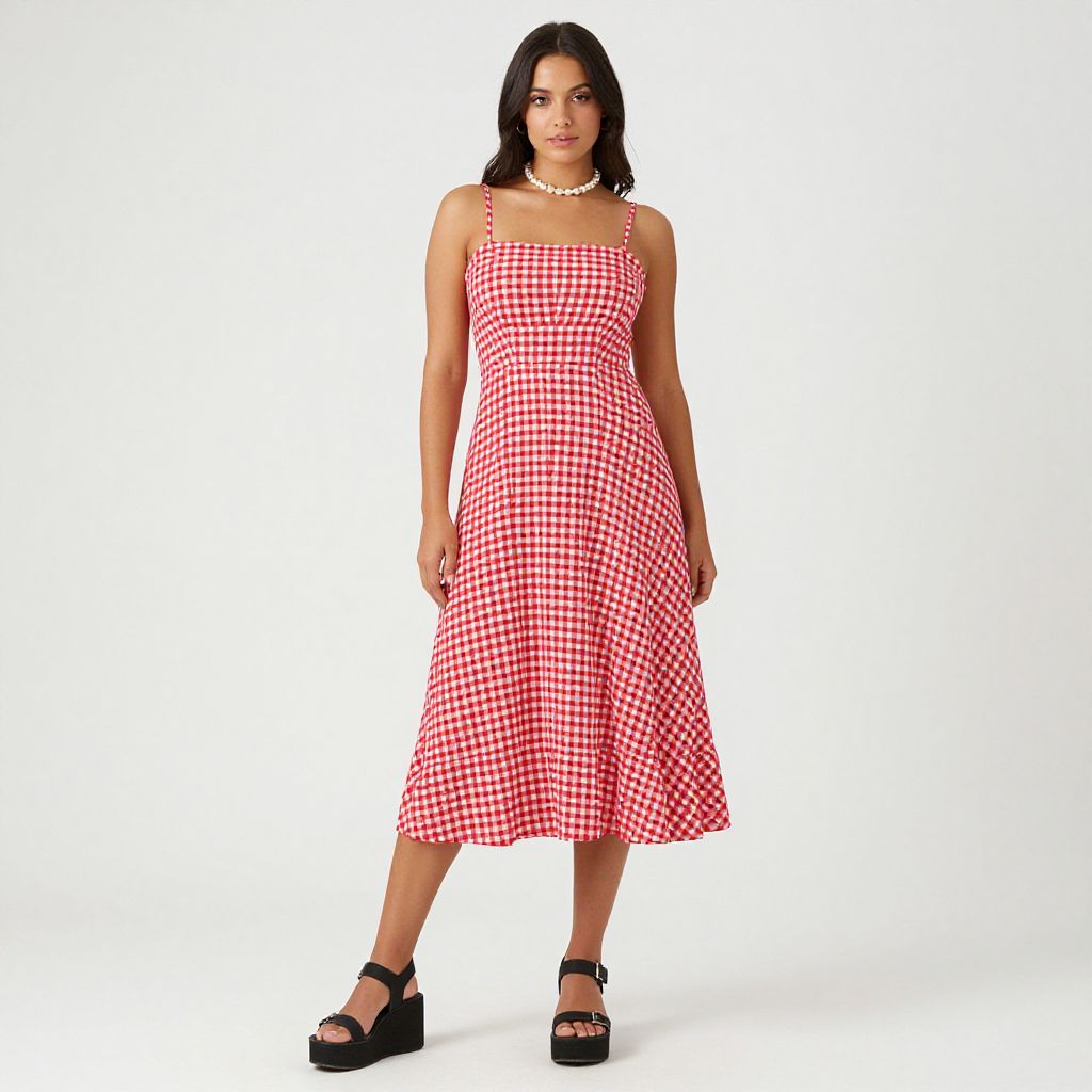 "Woman, casual summer, midi sundress in red and white gingham, spaghetti straps, straight neckline, slightly cinched waist, flowing skirt with flounce hem, black platform sandals with thick straps, pearl choker necklace, plain white studio background.. Sexy. Pretty face and beаutiful eyes. Big breasts."