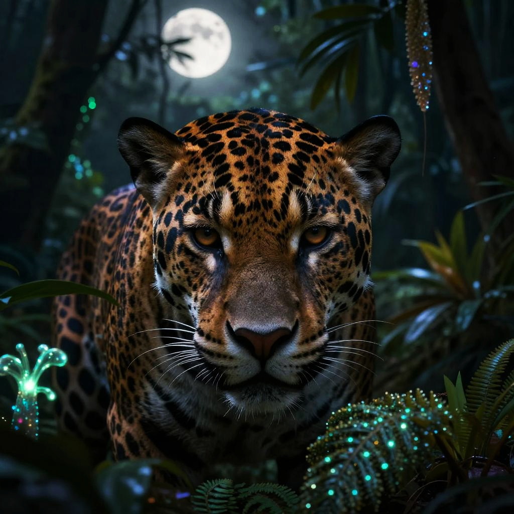 Photorealistic digital artwork of a fierce, spotted jaguar with glowing eyes, staring intently in a dark, moonlit jungle, surrounded by glowing