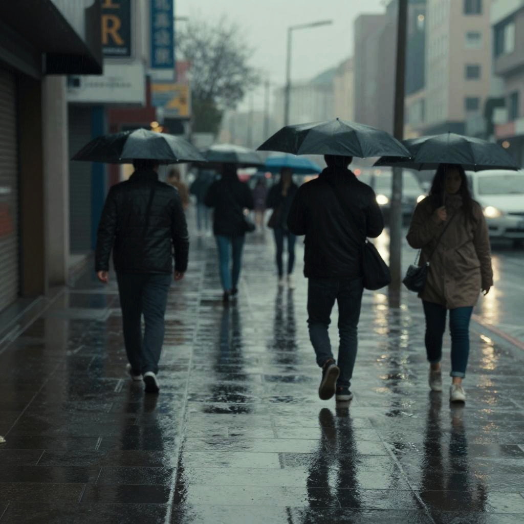 City street scene in low saturated colors, muted grays and blues, rainy weather with reflections on wet pavement, blurred pedestrians carrying umbrellas, cinematic mood, wide shot