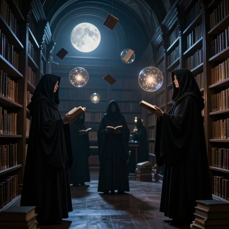 A captivating digital artwork depicting an enigmatic, age-old library from a unique aerial perspective as if witnessed through the gaze of a mythical creature. The expansive library stretches across vast distances, its walls lined with towering bookshelves brimming with countless volumes inscribed in diverse languages and scripts, each exuding an otherworldly luminescence that bathes the somber environment in a soft glow. At the heart of this intellectual sanctuary stands a solitary figure—a scholar enveloped in rich crimson garments—delving into ancient scrolls by the flickering light of candles, their features cast in gentle shadows as they decipher the cryptic wisdom locked within the parchment. The architectural fusion of Gothic and Art Nouveau elements harmoniously intertwines throughout the room, with ornate stained glass windows projecting a kaleidoscope of colors across the floor. This scene evokes an aura of awe and veneration, beckoning the observer to embark on a journey through the labyrinthine corridors of knowledge and chronicles concealed within these sacred confines.