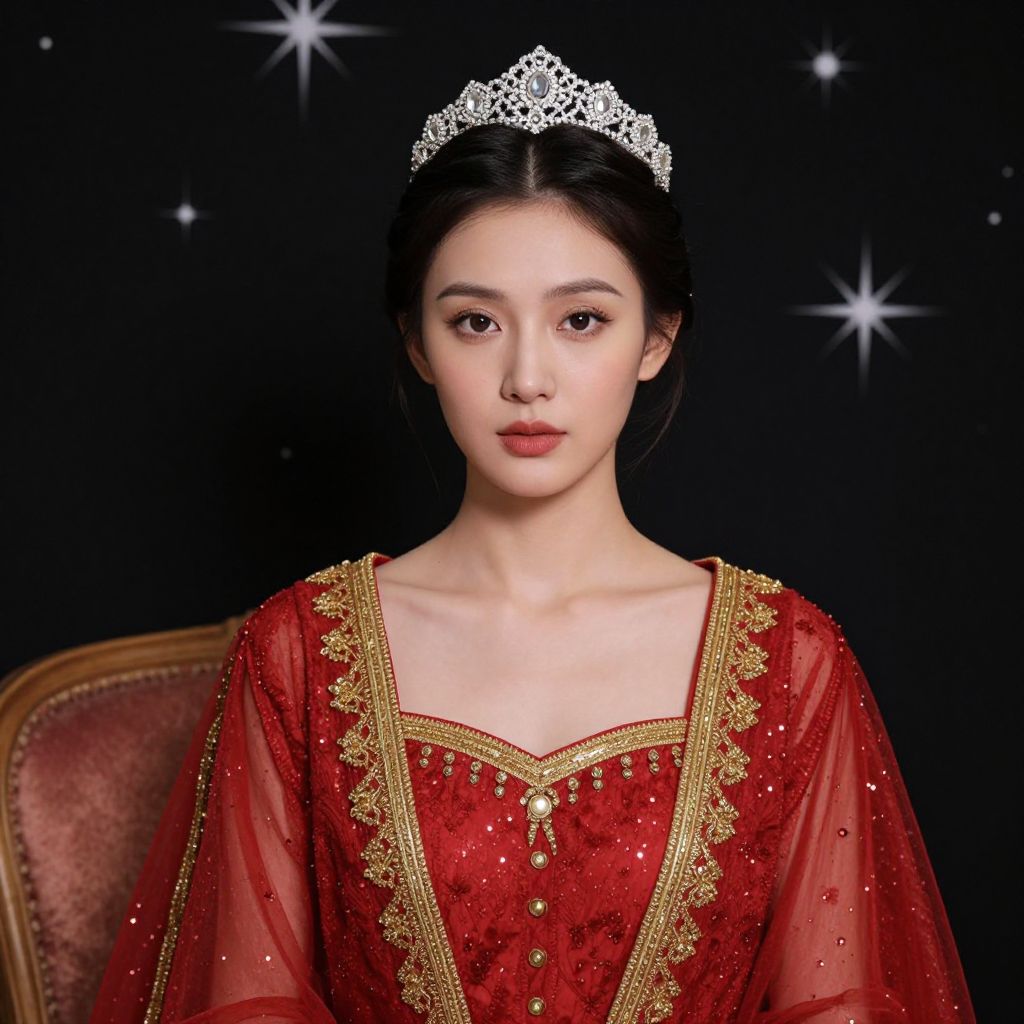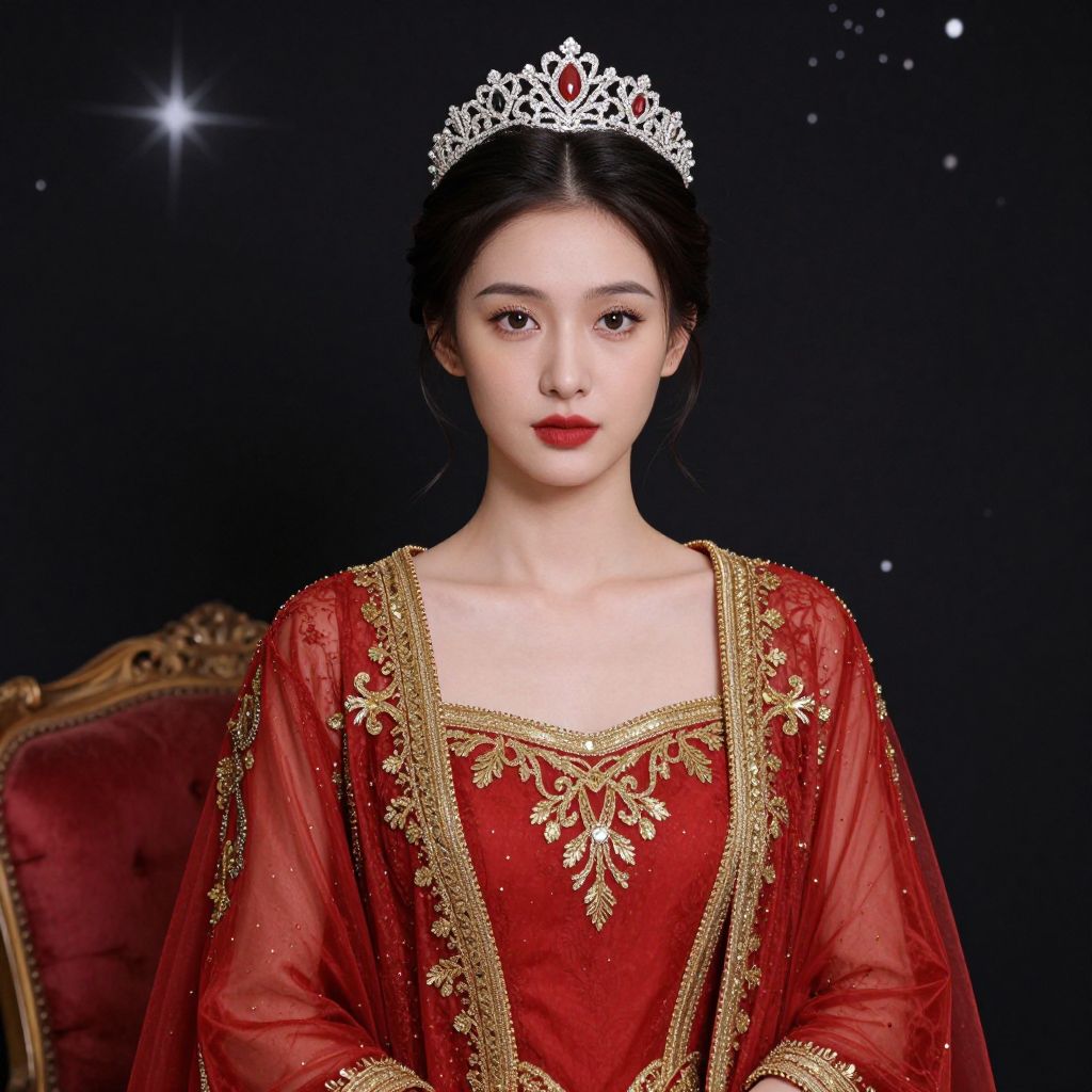 Elegant portrait of a woman adorned in a richly detailed red gown with gold embellishments, featuring a tiara atop her neatly styled hair, set against a dark, star-patterned backdrop with a plush cushion visible to the left.