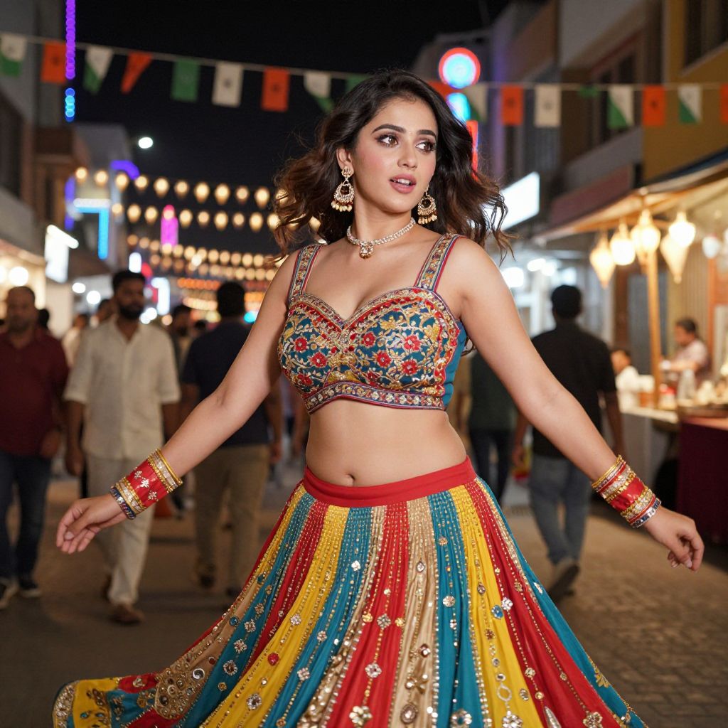 A lively outdoor scene of a woman in her late 20s with dark wavy hair and glowing brown eyes wearing a festive bacchon ghagra choli costume, dancing joyfully under a neon-lit night market in a city like Jaipur or Varanasi with traditional Indian flags and lanterns in the background.. The woman has big breasts and cute face