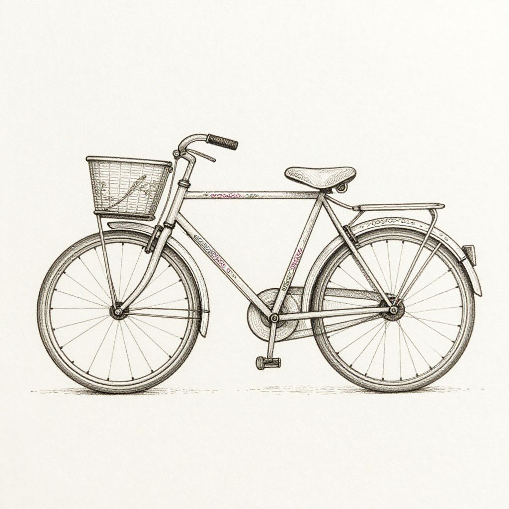 A line drawing of a vintage bicycle with delicate floral embellishments, elegant and detailed, hand-drawn style with thin precise lines, minimalist composition focusing on nostalgic charm and whimsy