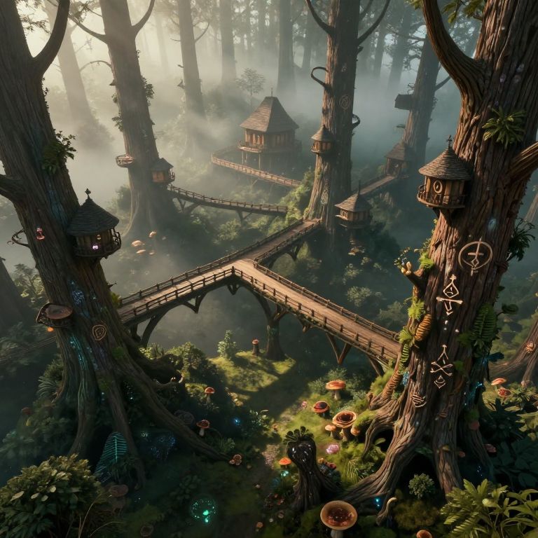 A surreal dreamscape unfolds in this captivating image, reminiscent of Dali's enigmatic visions intertwined with Tolkien's mystical realms. From an aerial viewpoint, the scene unveils a forest floor shrouded in mist, adorned with bioluminescent fungi and cryptic symbols etched into ancient tree trunks. As the perspective rises, it discloses a labyrinthine network of ethereal bridges connecting to secluded wooden dwellings hidden among the foliage. The soft yet dramatic lighting casts elongated shadows that dance across the scene, adding depth and intrigue. This evocative image traverses an emotional spectrum from serenity to fascination and curiosity, beckoning viewers on a mesmerizing voyage through a domain where reality merges with the fantastical.