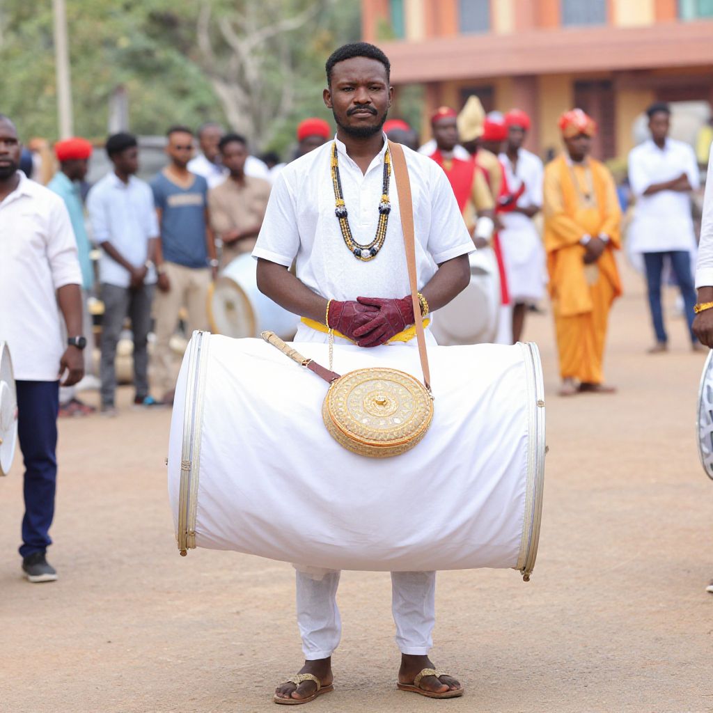 Photograph of an African man standing in an outdoor setting, wearing a white traditional outfit with gold trim and holding a large, round, woven drum. He has dark skin, a short black haircut, and a serious expression. He's adorned with gold necklaces and red gloves. In the background, other men in white and orange traditional garments, some with red hats, are visible. A red and orange building is partially seen, with green trees and a blurred crowd. The ground is sandy, and the overall scene is vibrant and culturally rich.