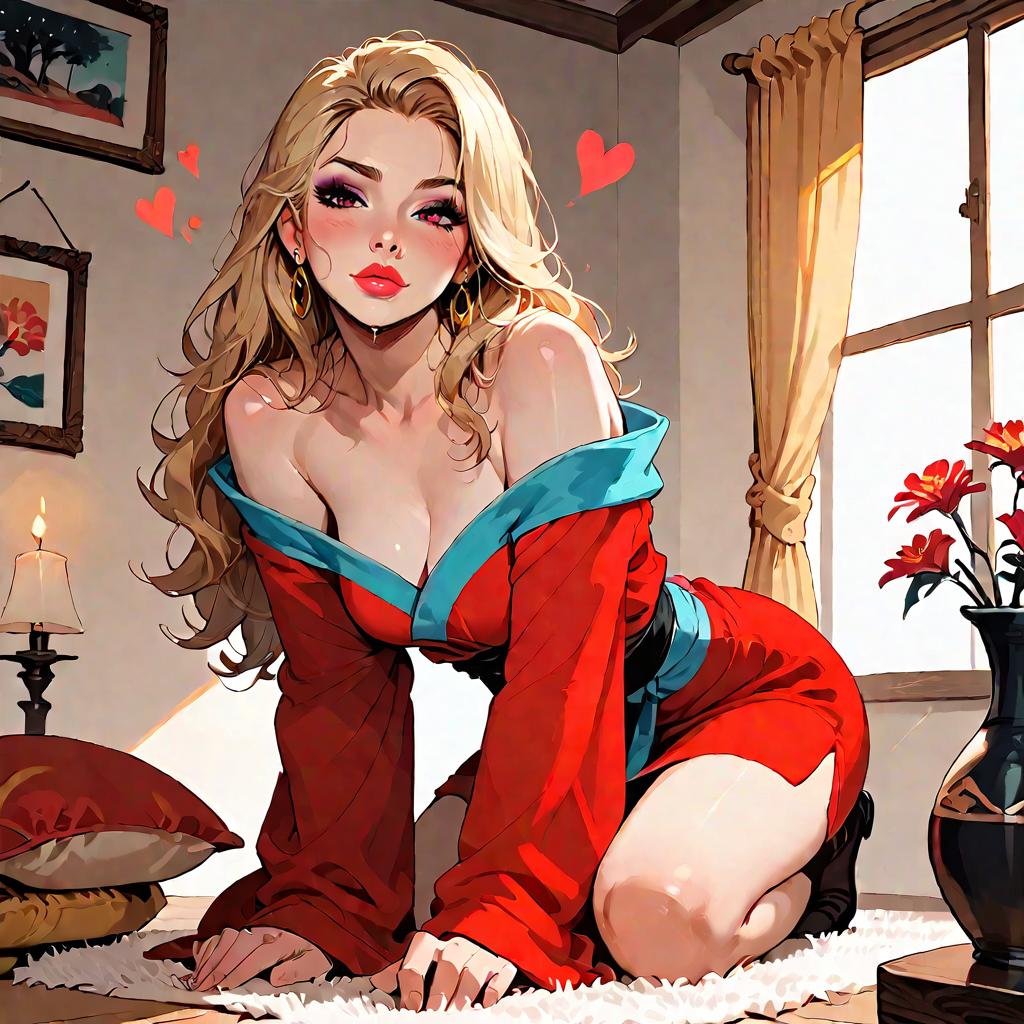 Digital illustration of a blonde woman with long hair, wearing a red kimono with a teal trim, kneeling on all fours on a white carpet in a cozy living room setting. The woman is posed suggestively with an off-shoulder kimono and a seductive expression, surrounded by warm candlelight, framed artwork, and flowers by a window with beige curtains. Red hearts float near her head, emphasizing romantic or affectionate mood.