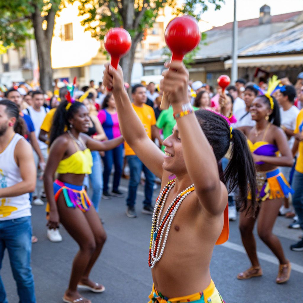 Maracas held in mid-air during a lively street festival, blurred crowd of smiling dancers and musicians in the background, bright colorful costumes with feathers and beads, dynamic motion blur showing rhythm and movement, sunlit urban setting filled with energy