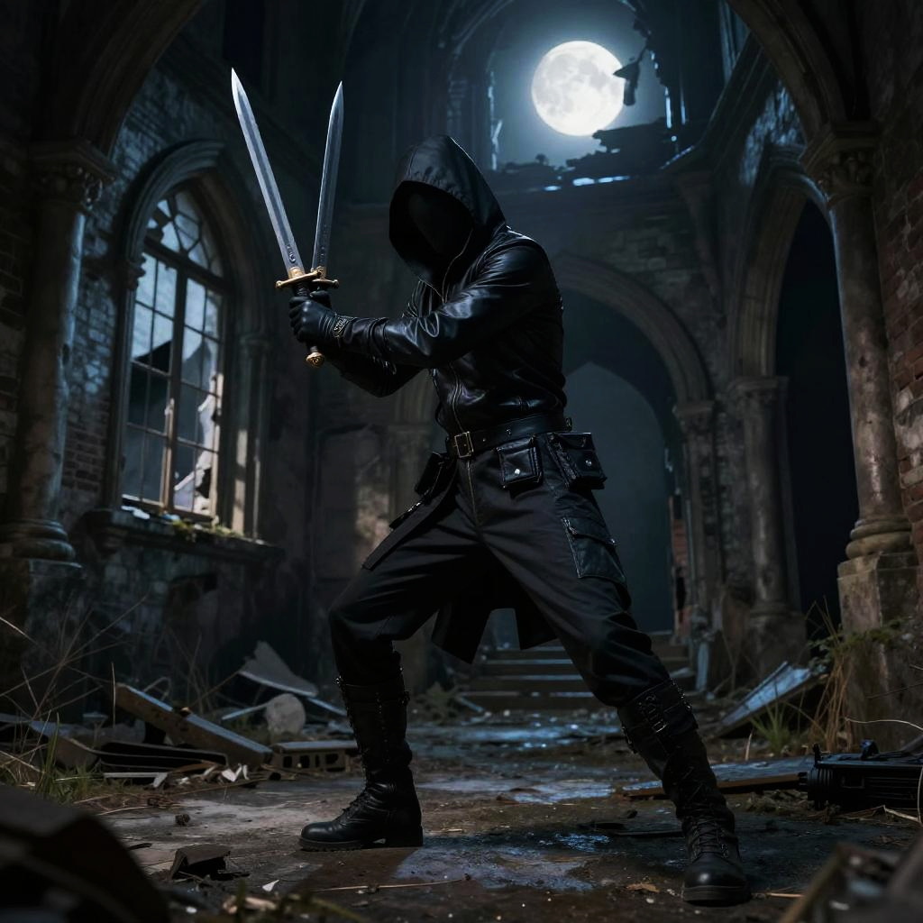 Sexy rogue, blending into the shadows of an ancient abandoned castle, poised to strike with dual daggers, sleek outfit with hidden pockets, moonlight filtering through broken windows, atmosphere moody and suspenseful, highly detailed environment