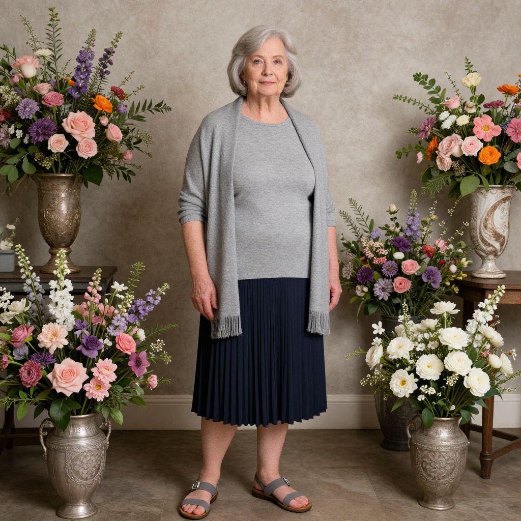 A mature woman with kind blue eyes and silver-streaked gray hair standing in a rural flower shop, holding a bouquet of roses, wearing a pair of classic black Mary Jane shoes with a small gold buckle, the soft natural light of a spring morning illuminating the shelves and floral arrangements behind her.