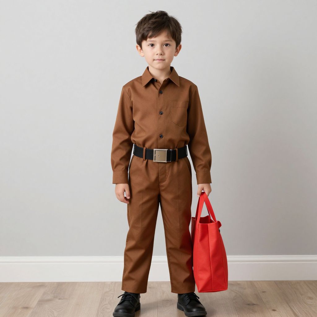 Photograph of a young boy with short, dark brown hair standing against a plain, light gray wall. He wears a brown, long-sleeved, button-up jumpsuit with black buttons and a black belt featuring a square buckle. His black shoes match his belt, and he holds a bright red tote bag in his right hand. The floor is light wood, and the overall style is minimalist. The boy looks directly at the camera with a neutral expression. The lighting is even, highlighting the colors and textures of his outfit and the bag.