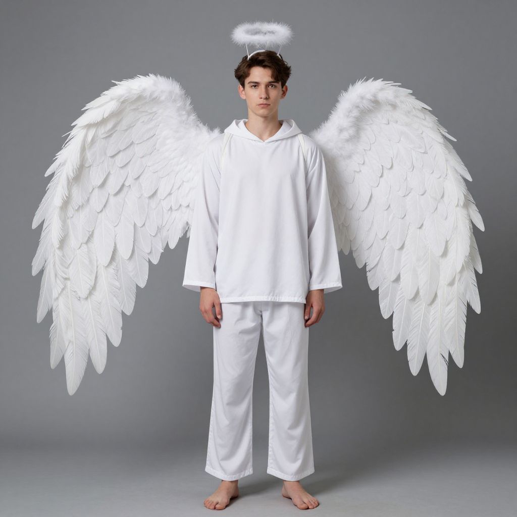 Photograph of a young man with short, dark curly hair, standing against a plain gray background. He wears a plain white hooded robe and white pants, barefoot, with large, white, feathered angel wings extending from his back. A glowing white halo floats above his head. His expression is neutral, and he looks directly at the camera. The lighting is even, highlighting the contrast between the white wings and robe against the gray background. The image has a clean, studio-like appearance.