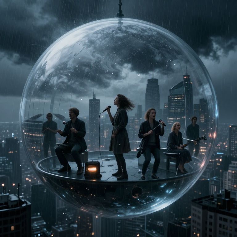 A digital art image depicts four musicians performing on a platform inside a massive, transparent, spherical bubble suspended in the rain-soaked night sky above a cityscape. The musicians, dressed in dark, stylish clothing, include a woman with curly hair singing into a microphone, a guitarist, a drummer, and a bassist. The background features a skyline of tall buildings with illuminated windows, under a cloudy, moonlit sky. Raindrops are visible on the sphere, adding a dramatic effect. The overall color palette is dark blue and gray, with the sphere illuminated by internal lights.