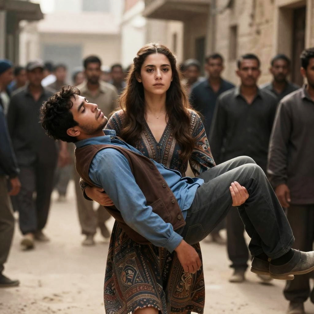 Young woman with long brown hair, wearing a patterned dress, carries a limp man in a blue shirt and brown vest over her shoulder. Narrow, dusty street with stone buildings. Crowded background, men in dark clothing, some with hats, watching. Sunlight filters through. Woman's expression is serious. Man's face is relaxed. Crowded, tense atmosphere.