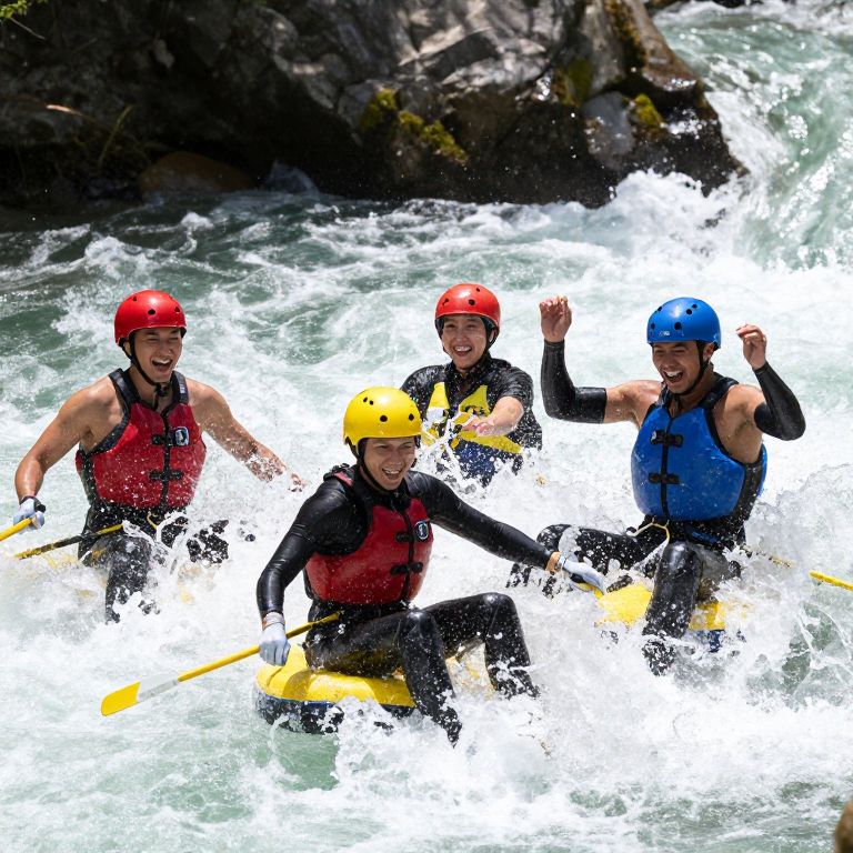 Ripples of laughter and unity cascade through the frothy waters as adventurers navigate the dynamic dance of nature, embodying the exhilarating freedom and shared joy of a spirited whitewater journey.