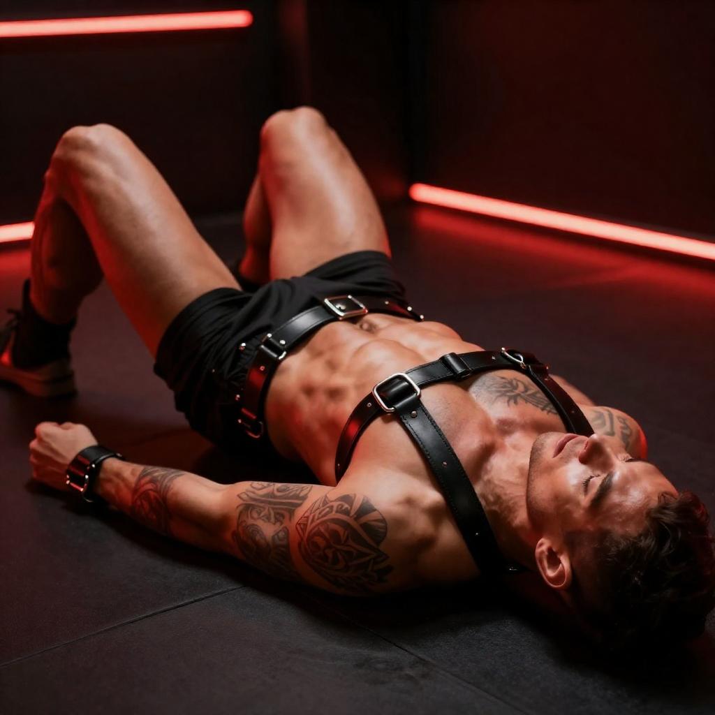 Photograph of a muscular man with tattoos, lying on his back in a dimly lit, red-lit room. He wears black leather straps and a harness, with his legs spread and arms resting on his chest. The background features dark walls with red LED lights. The man's skin is illuminated by the red light, highlighting his defined muscles and tattoos.
