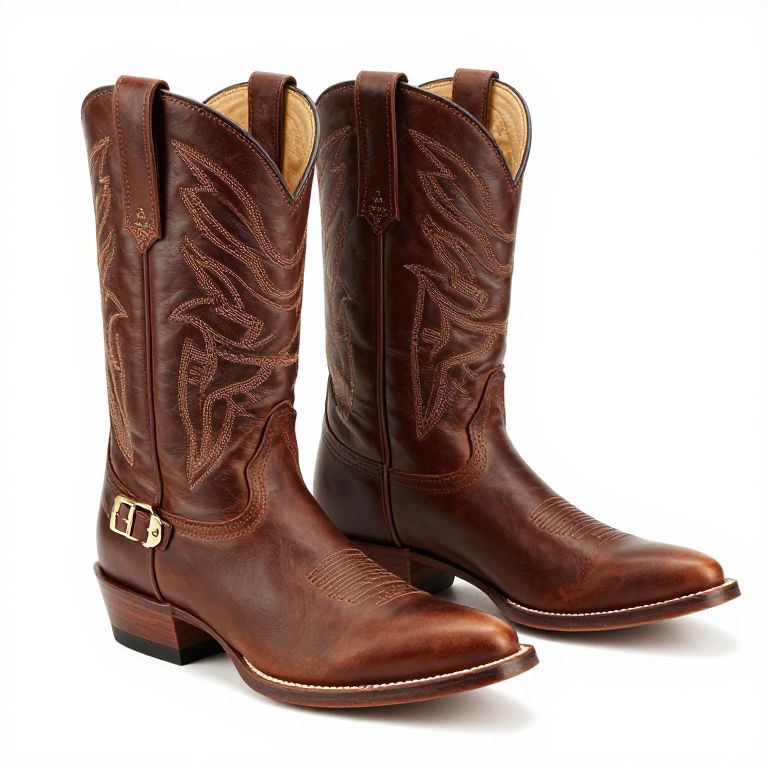 Photograph of brown leather cowboy boots with intricate silver embroidery, gold buckle, and wooden heel, standing side by side.