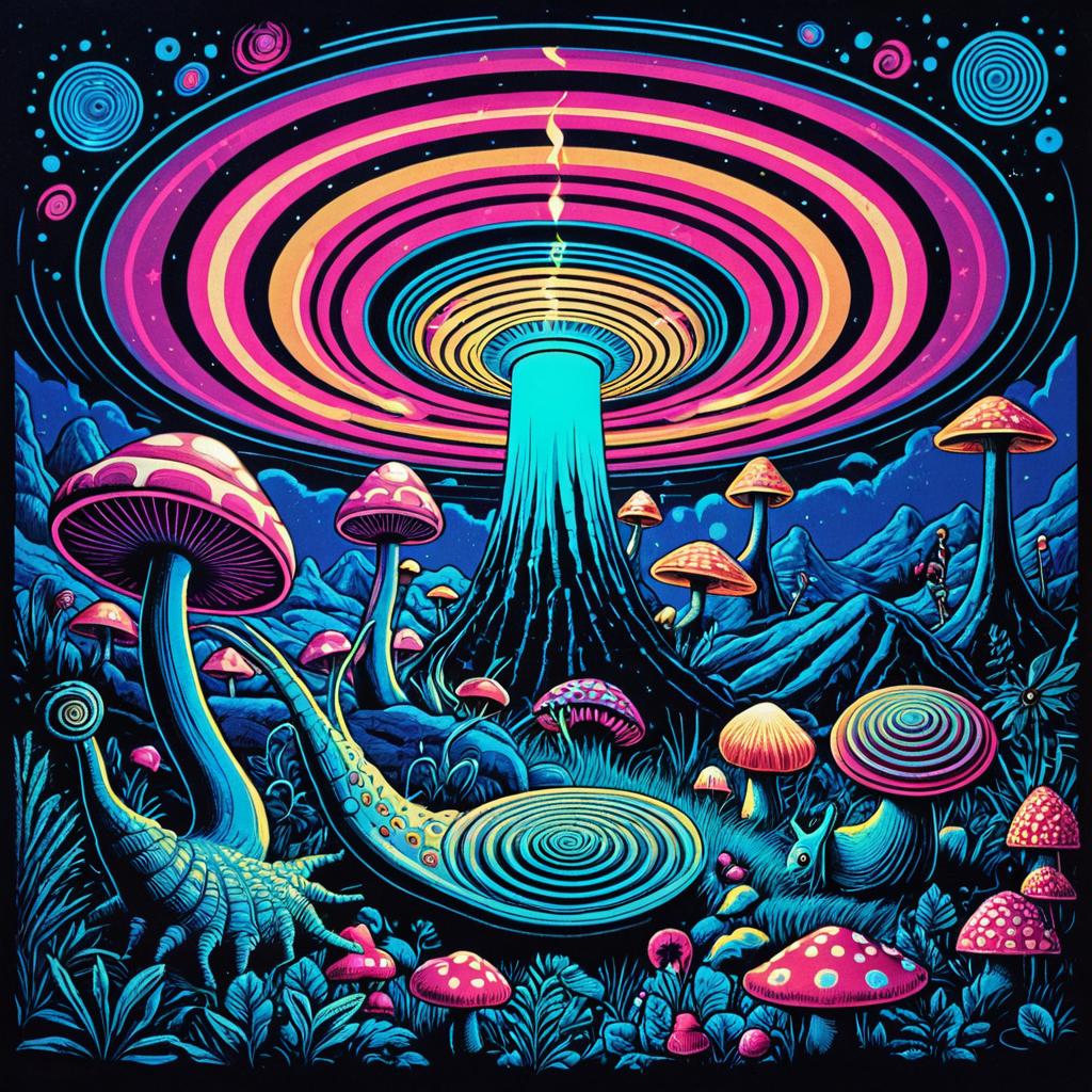 Vintage 70s black light poster of spiral snails, smoking joints, alien landscape, UFO flying saucers, psilocybin cubensis mushrooms, vibrant trippy colors, luminous ruby and sapphire, multidimensional kaleidoscope