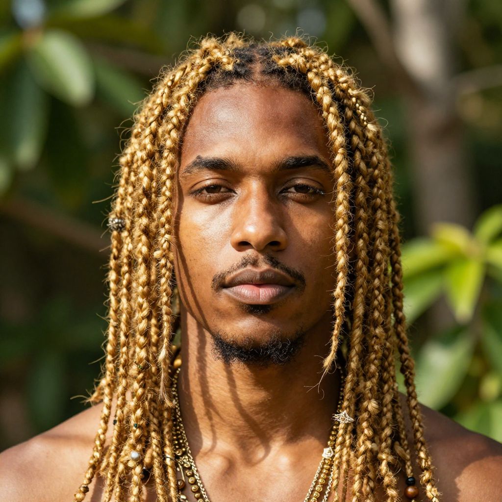Gold dreads male portrait in natural sunlight, warm golden tones highlighting textured dreadlocks, serene expression, surrounded by lush greenery, soft bokeh background, intricate jewelry accents, realistic skin details, artistic and vibrant style.