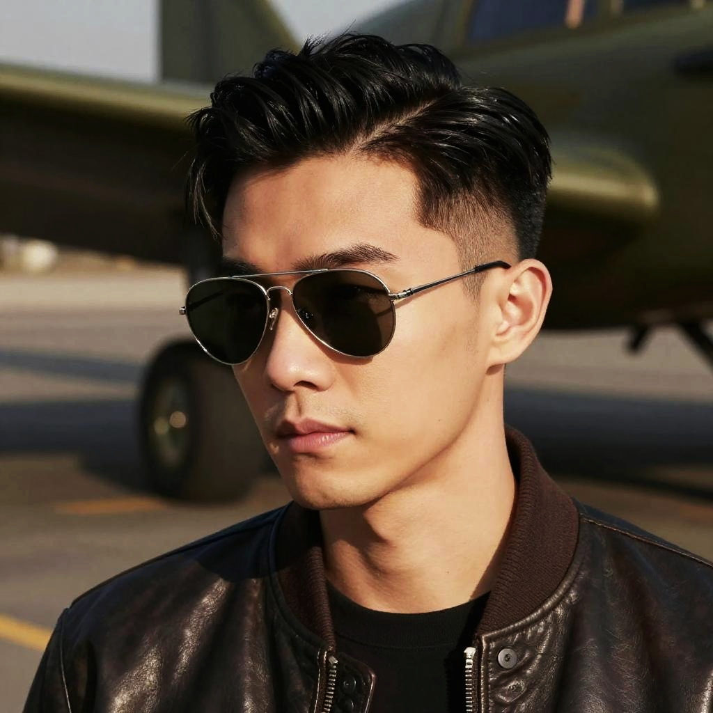 Close-up portrait of a man with an aviator haircut, clean fade on sides and voluminous swept-back hair, wearing leather bomber jacket and aviator sunglasses, dramatic shadows, stylish vintage aviation studio setting