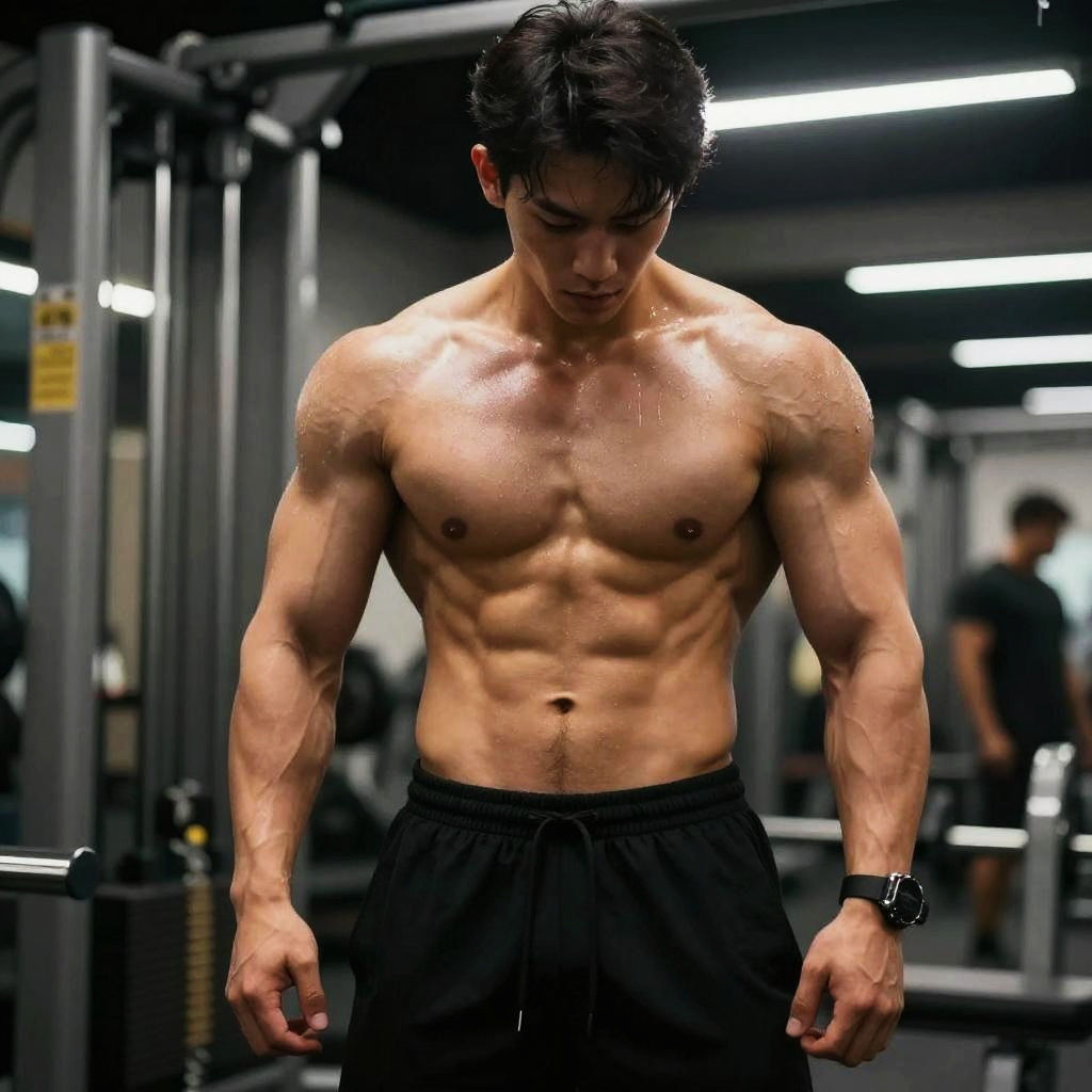 Masculine aesthetic fitness model posing in gym, muscular build, intense expression, sweat glistening under dramatic spotlight with industrial equipment in background