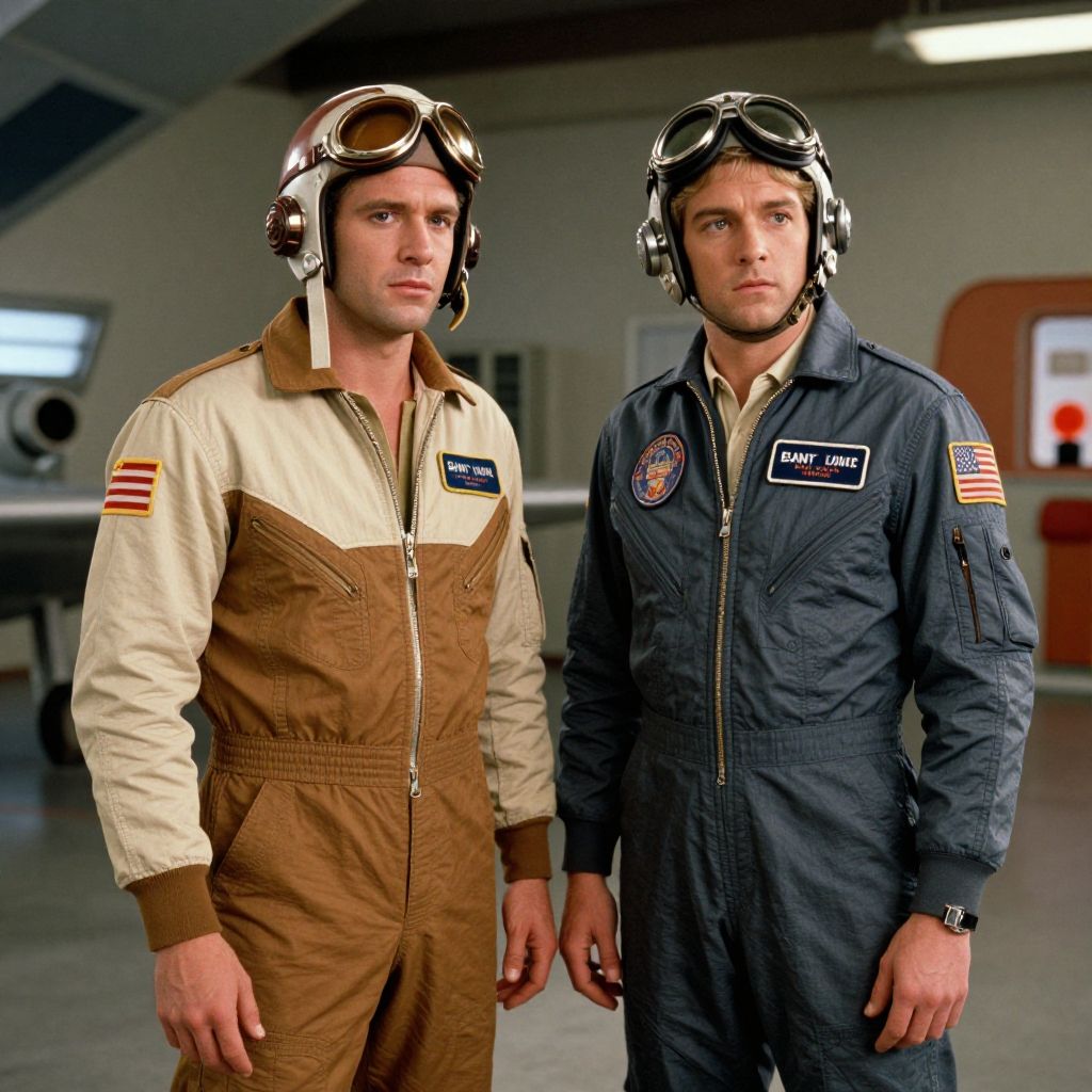 Maverick and Charlie costume scene in a retro 1980s airbase, showcasing stylish pilot gear with reflective helmets, flight suits adorned with patches and insignias, and a nostalgic color palette emphasizing warm tones and dynamic lighting effects.