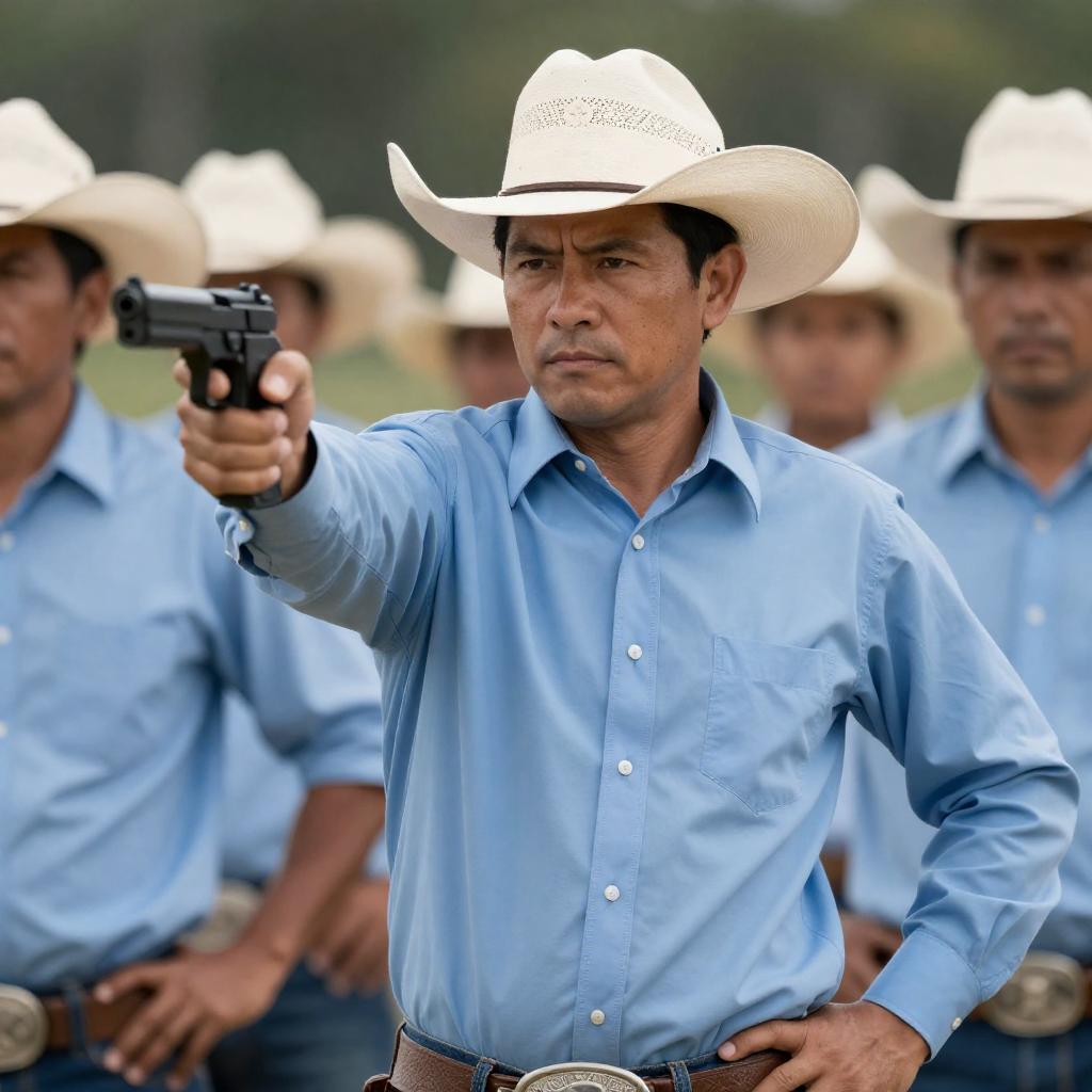 Photograph of a man in a white cowboy hat and light blue shirt, pointing a black handgun forward. He has a serious expression and is surrounded by other men in similar attire, with a blurred, wooded background. The man's right hand is extended, and his left hand rests on his hip.