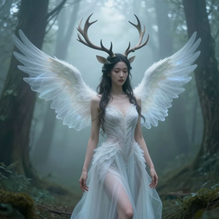 Digital artwork of a serene, ethereal woman with long, wavy black hair, deer antlers, and large, glowing white angel wings. She wears a translucent, white, feathered dress that flows gracefully. Her pale skin contrasts with the dark, misty forest background, where tall trees and soft light create a mystical atmosphere. The woman's expression is calm, and she stands with one leg slightly forward, exuding a sense of grace and otherworldliness. The overall mood is magical and enchanting, with a focus on the fantasy elements. The image uses soft, cool colors and a slightly blurred background to emphasize the subject.