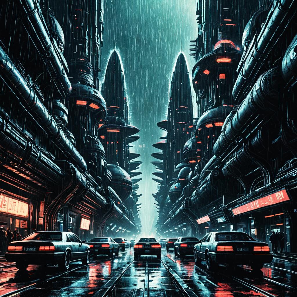 Illustration of a futuristic cyberpunk metropolitan skyline featuring towering, biomechanical-inspired buildings reminiscent of H.R. Giger's style. The street is lined with classic cars reflecting neon lights on wet pavement under heavy rain. Massive starships loom overhead, casting an intense atmosphere over the city.