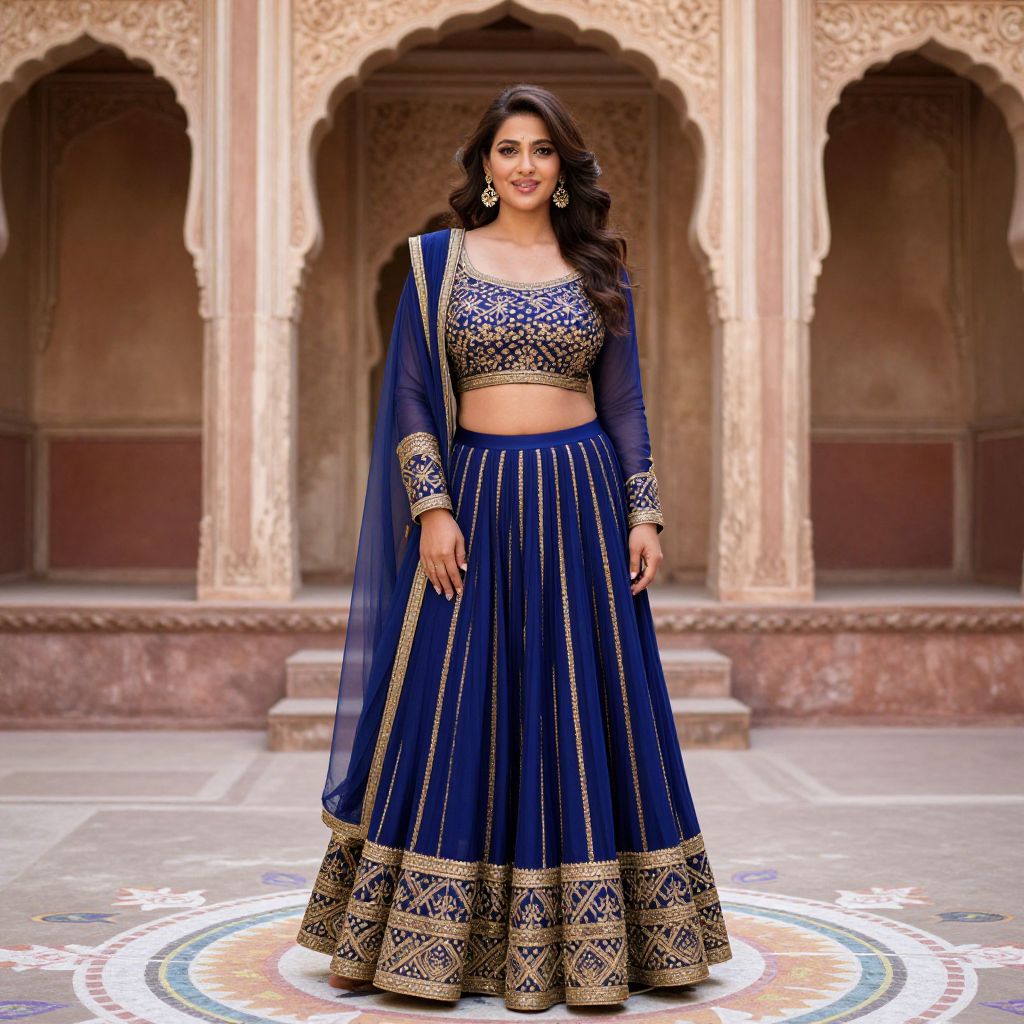 Photograph of an Indian woman standing in an ornate courtyard with intricate stone arches in the background. She has long, wavy black hair and is wearing a deep blue, traditional lehenga set adorned with gold embroidery. The crop top is square-shaped with long sleeves, and the full-length skirt features a gold border and intricate patterns. She has a medium build, fair skin, and is wearing large, circular gold earrings. The courtyard's circular design on the floor contrasts with the beige stone walls. The overall style is elegant and traditional, emphasizing cultural attire.