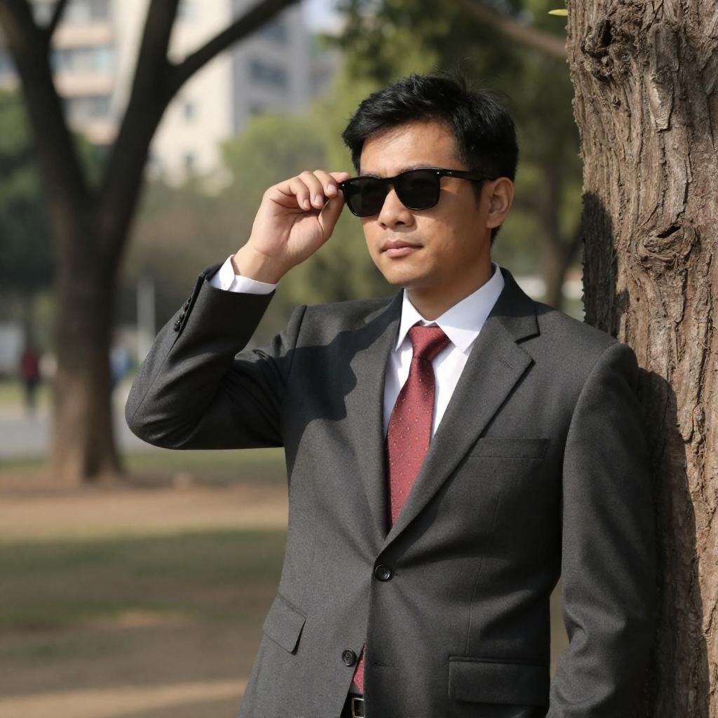 Photograph of a man with short, dark hair and sunglasses, wearing a gray suit with a white shirt, hands in pockets. He stands outdoors against a blurred background of green trees and a black metal fence. His expression is neutral, and the lighting is natural.