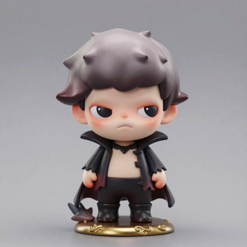 This is a digital image of a chibi-style figurine featuring a small, angry-looking vampire with pale skin, sharp teeth, and dark, pointed ears. The vampire has wild, grayish-brown hair and large, black eyes. It's dressed in tattered, dark clothing with a pinkish shirt. The figure is standing on a shiny, gold base with intricate patterns. The overall look is cute yet menacing.
