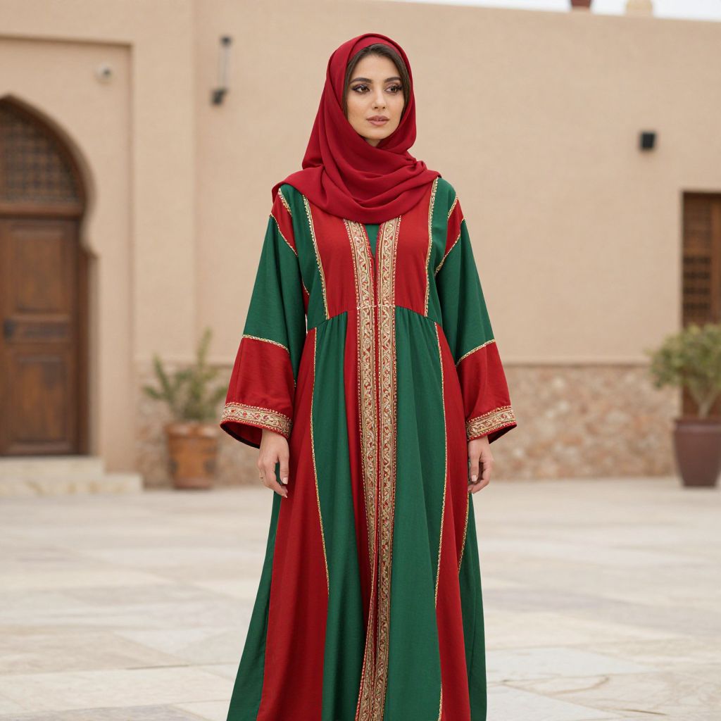 Moroccan Outfit Female, a woman in a red and green dress and a red turban