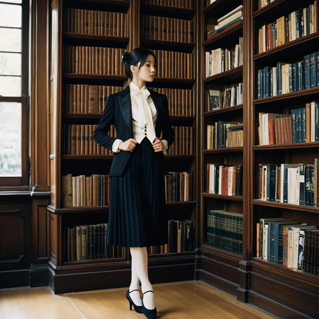 A graceful ballerina, wearing a classic three-piece suit with a silk cravat, standing in a vintage library with tall bookcases, expressing contemplation, illustrated in the elegant and classic manga style of Toshiko Ueda.