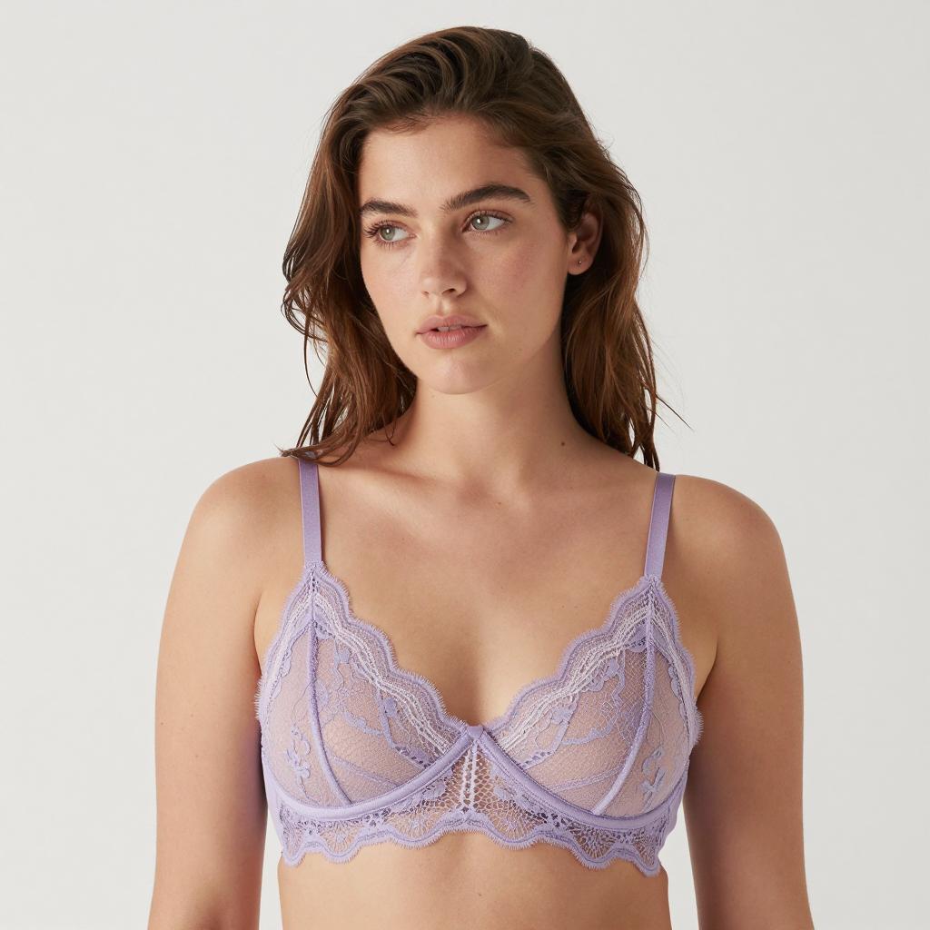 Photograph of a slim, young woman with long, straight brown hair and light skin standing against a plain white background. She's wearing a small, purple string bikini that highlights her small breasts and toned stomach. The lighting is even, with no shadows, and the camera angle is straight-on. The background is completely blurred, keeping the focus on her. The depth of field is shallow, emphasizing her figure.