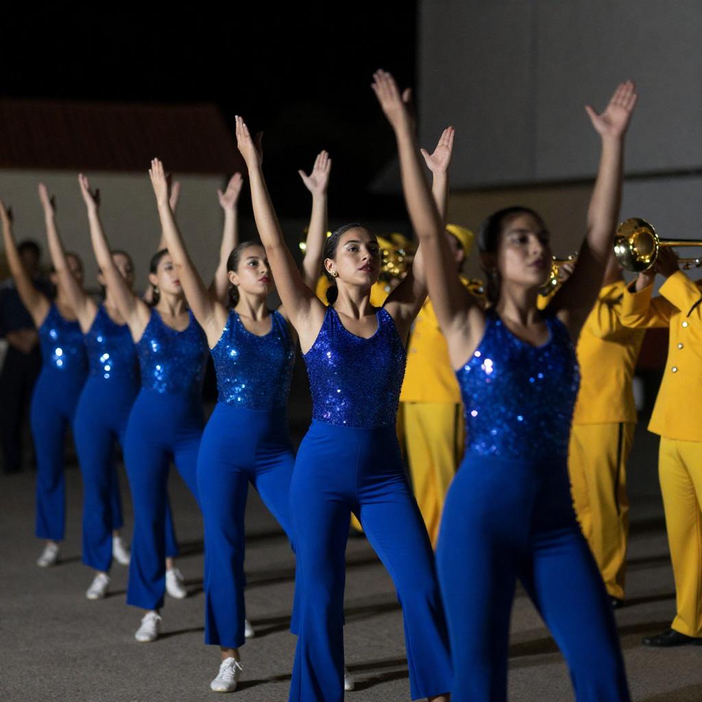 Photograph of a live performance. Female rapper in midriff-baring black crop top and shiny black pants, arms raised, center stage. Four male dancers in black shirts and pants, bent forward, to her left and right. Stage lit with purple and blue lights. Brick wall background. Drum set visible behind dancers. Intense, focused expressions on rapper and dancers.