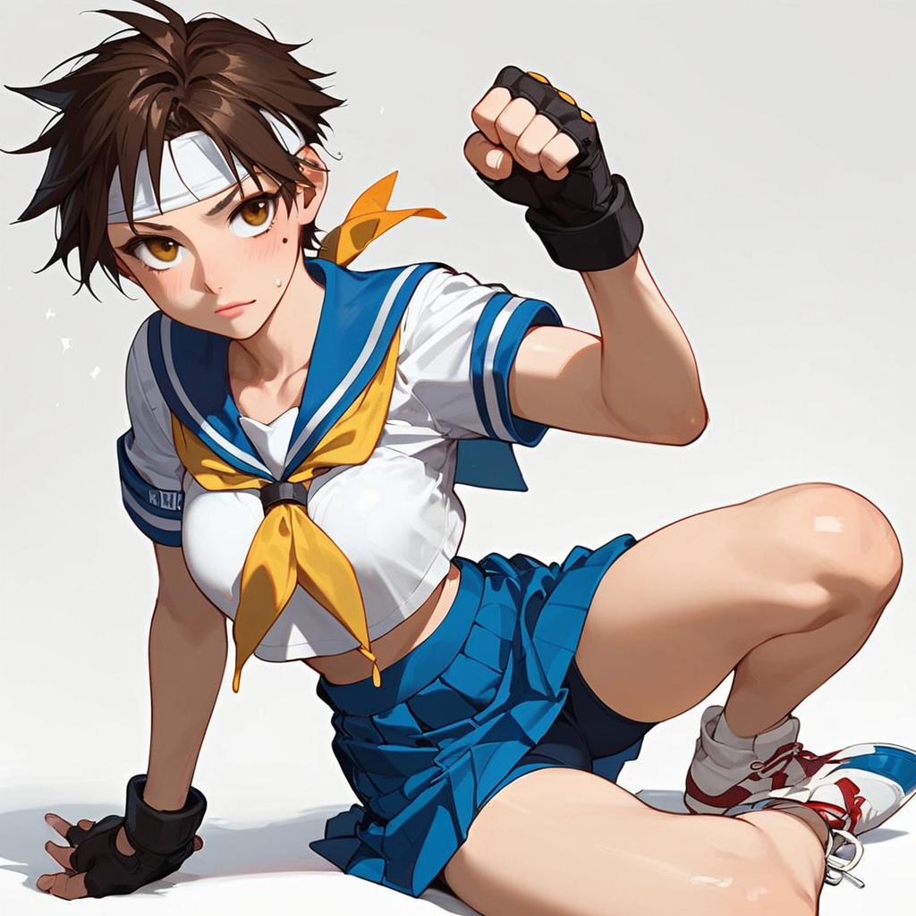 Source_anime, in kinu-sensei artstyle, 1girl, blue sailor collar, brown eyes, brown hair, buruma, clenched hands, fingerless gloves, gloves, headband, kasugano sakura, midriff, neckerchief, school uniform, serafuku, shoes, short hair, simple background, skirt, sneakers, solo