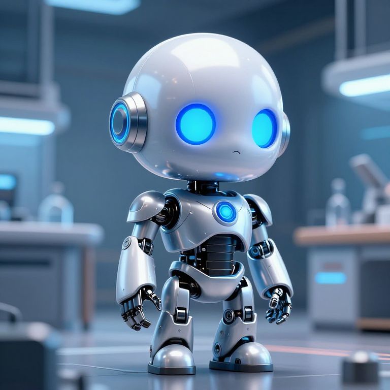 Photorealistic CGI image of a small, white, humanoid robot with a round, shiny head, and large, glowing blue eyes. The robot has black joints and blue glowing circular details on its chest and head. It stands in a futuristic lab with blurred, blue-lit background elements, including lab counters and equipment. The robot has a cute, childlike appearance with a slight frown on its face. The lab setting has a sleek, modern aesthetic with metallic and glass surfaces. The image emphasizes a sci-fi and robotic theme.