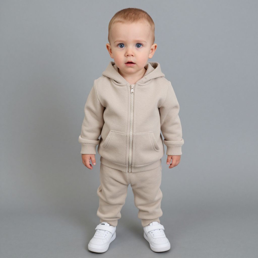 A small child is wearing a beige hoodie and pants with a pair of white sneakers. The child has short hair and blue eyes.
