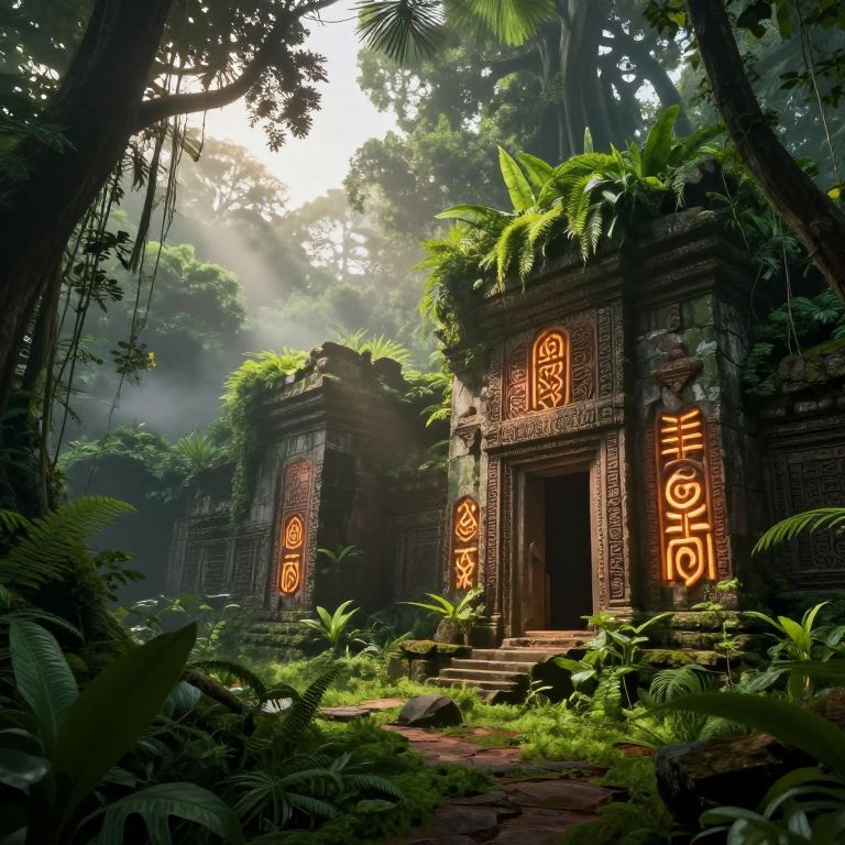 Photograph of an ancient, jungle-covered temple with glowing orange hieroglyphs, surrounded by dense greenery and sunlight filtering through trees.