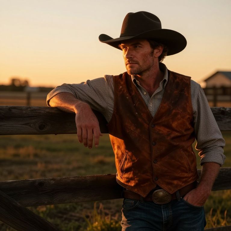 Handsome cowboy leaning on a wooden fence in a rustic ranch, sunset casting warm light on his weathered face, wearing a worn leather vest and hat, photorealistic with dramatic shadows