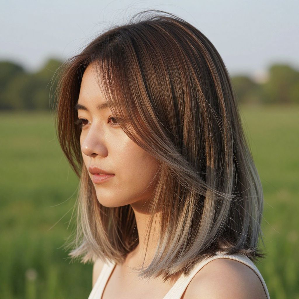 Woman with frosted edge cut hairstyle, sun-kissed dimension and warm undertones bringing life to her medium-length hair, soft highlights mimicking sunlight, serene outdoor landscape, balanced composition, natural expression, lush green surroundings, photorealistic rendering, detailed hair strands, Dall-E style