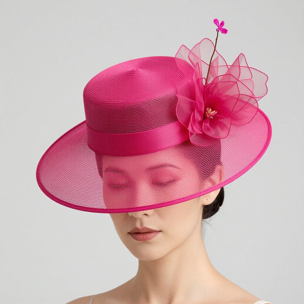 Woman wearing a vibrant fuchsia millinery hat adorned with sheer floral accents and a delicate stem, showcasing elegant craftsmanship against a neutral backdrop.